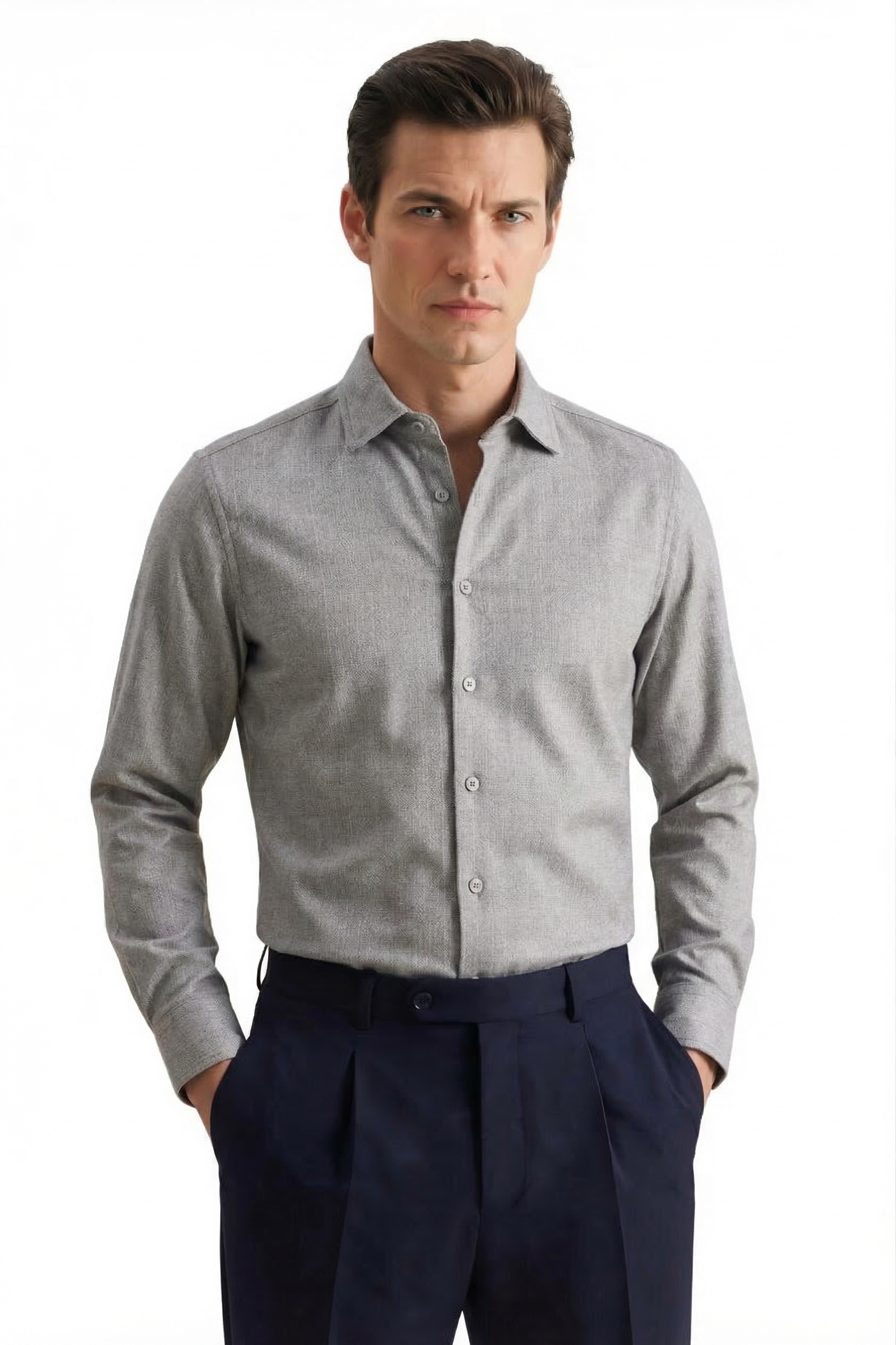 • Приталенный силуэт, Классический воротник, Классический (на пуговице), Однотонный, Серый